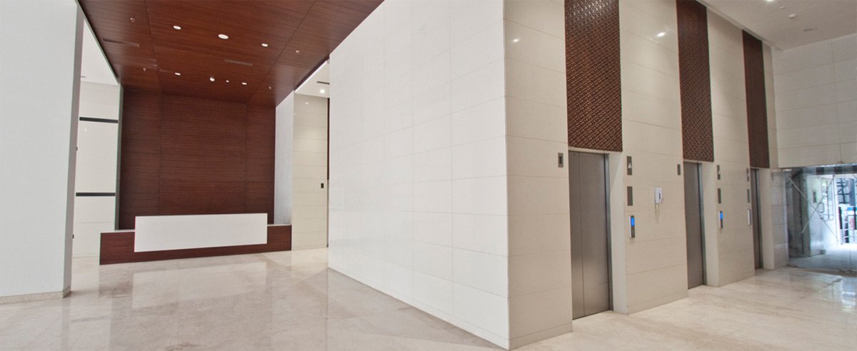 The modern and elegant design of the common areas of these two corporate towers leads to a creative work environment and inspires innovation, with a dash of handcrafted burnt solid wood & veneer paneling on the columns amidst the white sheathe common to the main entrance lobby and subsequent lift lobbies on all floors adding charm and sophistication to the scheme. The light tone of interiors is complemented by the playful staggering of leather finish black granite on the walls which enhances the futuristic look and tone of the theme.