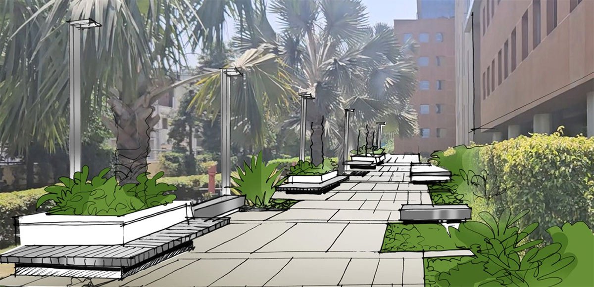 To match evolving expectations and the quality of outdoor amenities now being delivered in contemporary tech parks, SP Infocity is being upgraded comprehensively. Along with planned improvements to the interiors and façade, the landscape design proposes a state-of-the- art campus experience with crisp detailing, bespoke features, a carefully curated planting palette, and an enhanced arrival experience with outdoor amenity gardens.